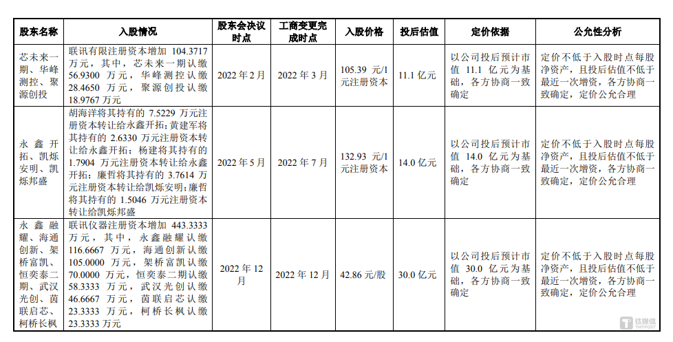 而在公司发展历程中,2022年出现的估值短期大幅飙升现象备受关注。2022年2月,芯未来一期、华峰测控、聚源创投以105.39元/1元注册资本的价格对联讯仪器进行了增资,公司投后估值11.1亿元;2022年5月,胡海洋将其持有的7.5229万元注册资本转让给永鑫开拓;黄建军将其持有的2.6330万元注册资本转让给永鑫开拓;杨建将其持有的1.7904万元注册资本转让给永鑫开拓;廉哲将其持有的3.7614万元注册资本转让给凯烁安明;廉哲将其持有的1.5046万元注册资本转让给凯烁邦盛,转让价格均为132.93元/1元注册资本,公司投后估值14亿元;2022年12月,永鑫融耀、海通创新、架桥富凯、恒奕泰二期、武汉光创、茵联启芯、柯桥长枫以42.86元/股价格向联讯仪器进行了增资,公司投后估值30亿元,这也意味着,在2022年3月-2022年12月,短短9个月的时间内,联讯仪器的估值暴增了2.7倍。