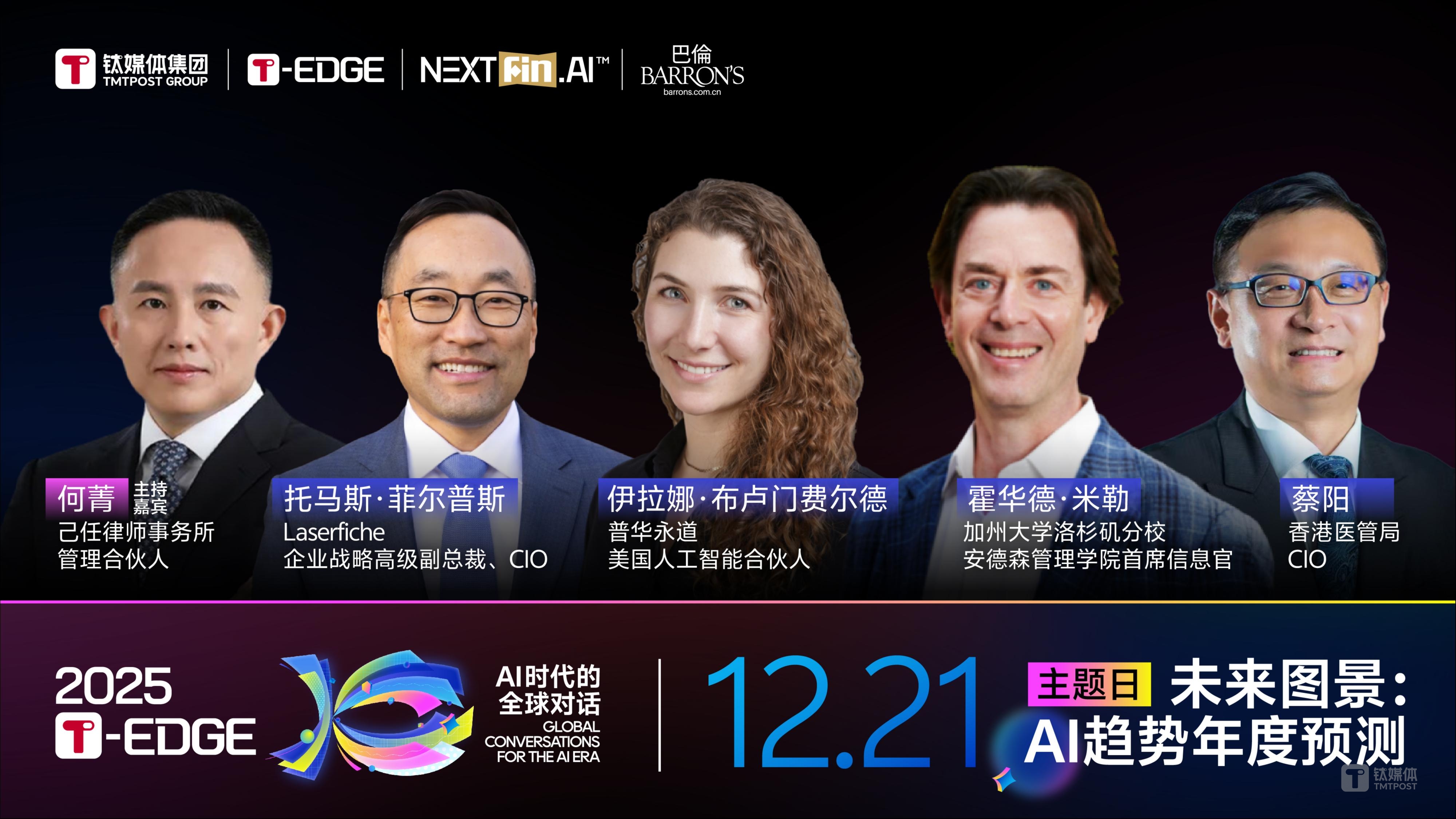 日前,在钛媒体2025 T-EDGE举办期间,Laserfiche企业战略高级副总裁兼CIO托马斯·菲尔普斯、加州大学洛杉矶分校安德森管理学院的CIO霍华德·米勒、香港医院管理局CIO蔡阳、普华永道美国人工智能合伙人伊拉娜·布卢门费尔德汇聚一堂,在己任律师事务所管理合伙人何菁的主持下,分享了包括CIO在企业中职责、数据,以及AI合规等在内的话题。