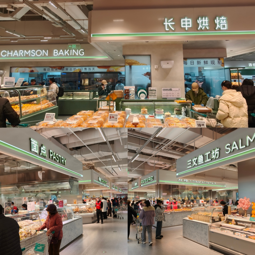 此外,店内分区招牌更新为温馨的白绿配色,灯光设计更趋柔和;分区规划亦同步优化,入口处即设烘焙区,沿主动线向店内延伸,依次布局果蔬生鲜区、水产及肉制品区,末端为鲜食加工区,契合当下新商超的分区设计潮流。