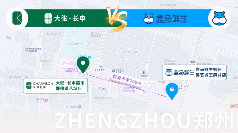 事实上,早在2025年5月,大张便已官宣将在郑州锦艺城布局长申超市门店。值得关注的是,该店与同在锦艺城的盒马门店直线距离仅700米,这般超近距离的“贴身肉搏”,在中国零售商业史上颇为少见。