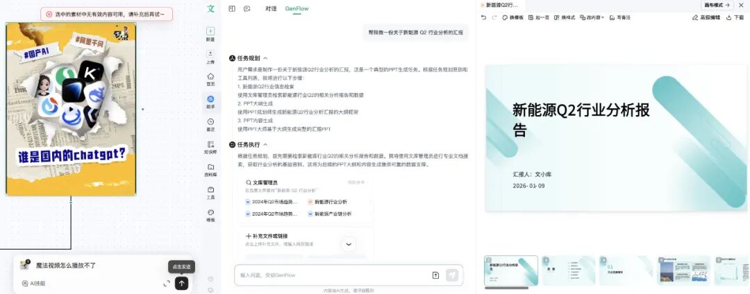 (图左:自由画布生成魔法视频 图右:行业报告PPT生成)