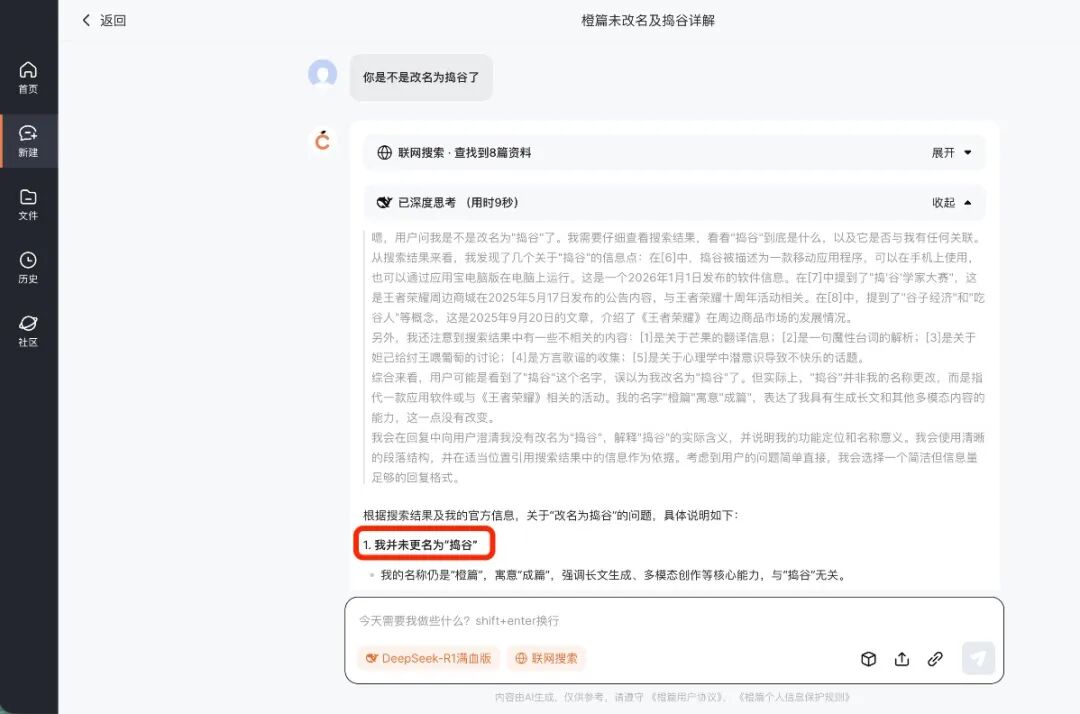 更值得玩味的是,这次更名没有发布会、没有大规模宣发,甚至连橙篇自己——更准确说是挂在文库里的AI助手GenFlow都不知道这件事:当我问它“你是不是改名为捣谷了”,它经历一番“深度思考”后,非常笃定地回答我:没有。
