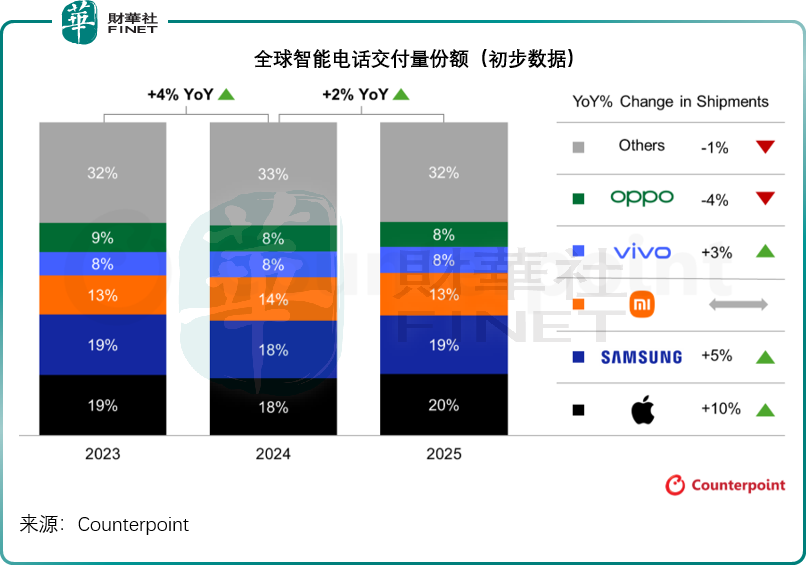 根据调研机构Counterpoint的最新数据,2025年苹果和三星的出货量分别按年增长10%和5%,稳居全球第一和第二,合共市场份额或达到39%,见下图。