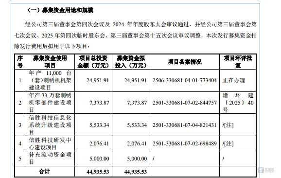 信胜科技此次IPO欲募集44935.53万元,分别用于年产11,000台(套)刺绣机机架建设项目、年产33万套刺绣机零部件建设项目、信胜科技信息化系统升级建设项目、信胜科技研发中心建设项目、补充流动资金项目,具体情况如下: