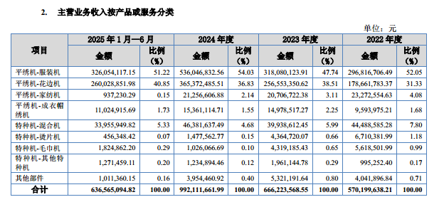 其中服装机与花边机构成公司营收的核心支柱。2022年-2024年及2025年1-6月(下称“报告期”),服装机销售收入分别为2.97亿元、3.18亿元、5.36亿元、3.26亿元,占主营业务收入比例为52.05%、47.74%、54.03%、51.22%;花边机销售收入分别为1.79亿元、2.57亿元、3.65亿元、2.6亿元,占比达31.33%、38.51%、36.82%、40.85%,两大产品合计贡献超8成营收,成为业绩增长的核心驱动力。