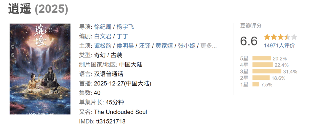 例如豆瓣开分6.6的《逍遥》虽因13天仓促收官的“防爆式”排播压缩了话题发酵周期,但核心设定的套路化、主演与角色的适配性争议、部分人设逻辑的前后割裂等才是导致其无法大范围传播的更关键因素。