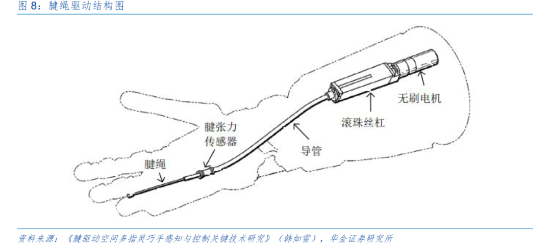 传动方式上,腱绳传动可实现远距离动力传递,灵巧手前臂中的电机通过齿轮箱驱动滚珠丝杠,通过滚珠丝杠上的螺母将旋转运动转化为直线运动,腱绳形成一个腱环套在螺母上,螺母拉动连接在灵巧手手指指骨上的腱绳,实现手指饶关节轴的转动运动。