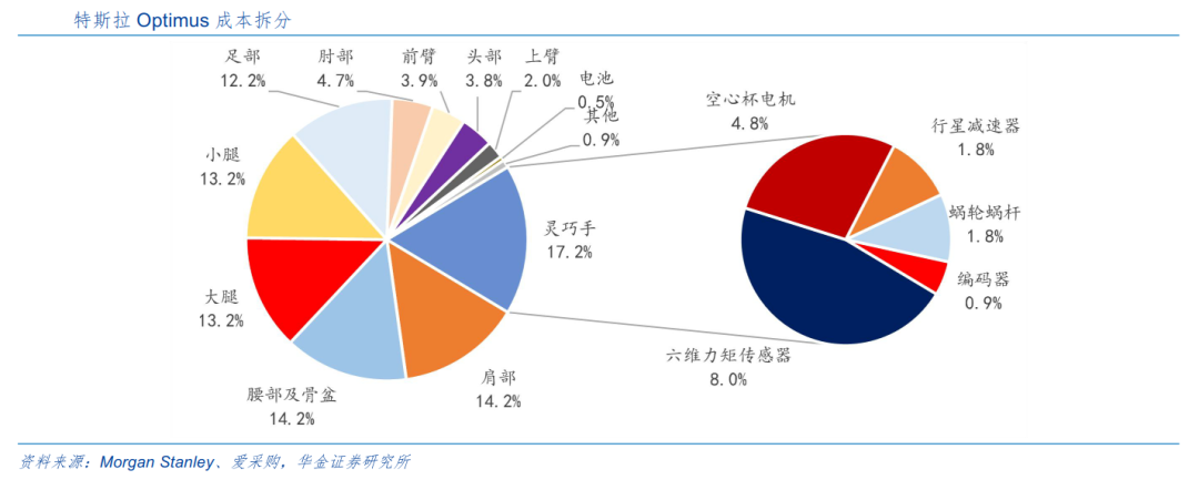 成本方面,灵巧手约占整机成本17%,成本层面灵巧手是整机最重要的部件之一。以特斯拉Optimus为例,从整机各部位的成本拆分来看,灵巧手成本占比约为17.2%,占最大比重,其中空心杯电机、六维力传感器分别占比4.8%、8.0%,行星减速器、蜗轮蜗杆、编码器分别占比1.8%、1.8%、0.9%,空心杯电机与六维力矩传感器是灵巧手中的核心部件。