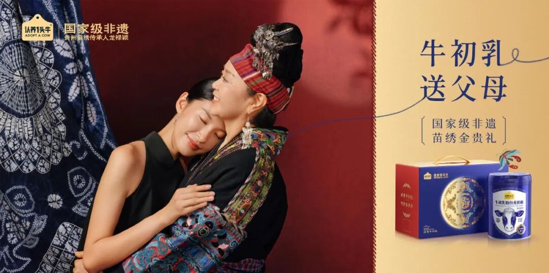 认养一头牛在2024年联名紫禁文创推出的“初乳御品”礼盒以及去年绑定“中秋团圆”场景推出贵州苗绣联名礼盒,就是这一逻辑的体现。