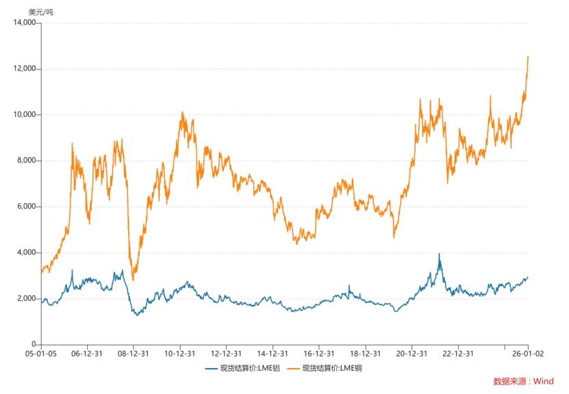 当前铜铝价格比值已处于近 20 年以来的历史高位区间,该比值自2005年 1.7倍的低点起,整体呈现震荡上行态势,截至目前已攀升至4.21倍的水平。