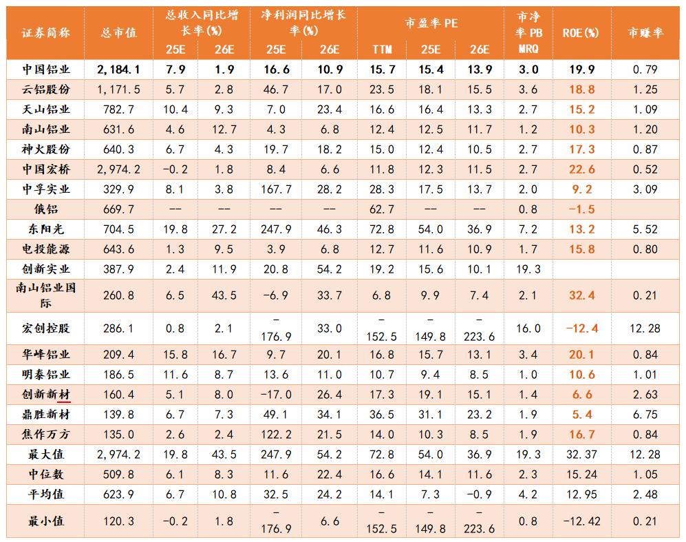 ROE居前的是南山铝业、华峰铝业、中国宏桥、中国铝业等。