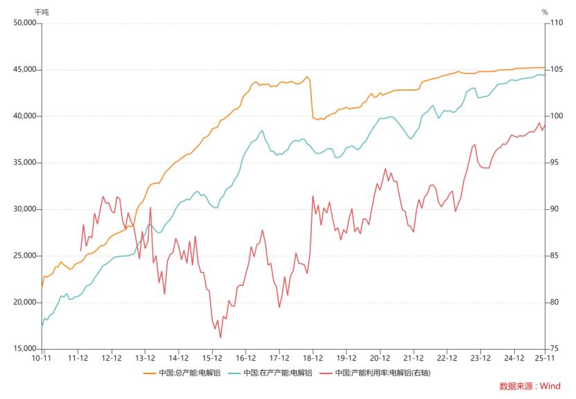 截至25年10月,我国电解铝总产能4523.2万吨,未来产能以置换为主,政策层面已锁定上限。24年以来产能利用率94.46%上升至99%左右,接近满产。