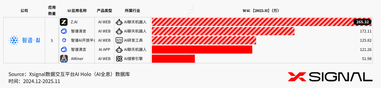AI领域知名数据分析机构Xsignal发布的AI创业公司App月活数据显示:截至2025年11月,智谱的智谱清言App月活为121.26万,网页月活为172.11万,海外z.ai为265.32万,加起来为560万;MiniMax App为57.99万,网页为30.31万,共计不到90万。