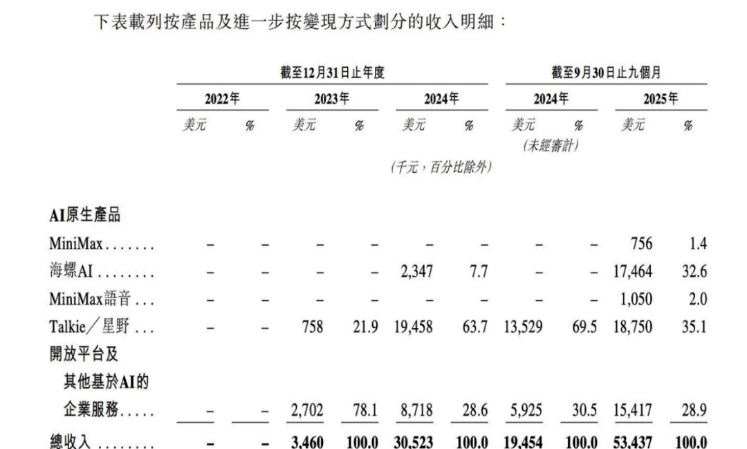 过去三年,MiniMax的收入也呈现出爆发式增长,2023年-2025年前三个季度,分别为350万美元(约为人民币2464.4万元)、3050万美元(约为人民币2.2亿元)和5340万美元(约为人民币3.8亿元)。