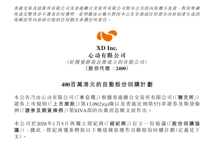 关键在于,在《心动小镇》上线前夕的1月5日,心动发布了4亿港元自动股份回购计划的公告。该公告显示,心动于2026年1月5日与独立经纪商签订了一份协议,启动一项总额4亿港元的大规模股份回购计划,有效期至2026年6月4日。