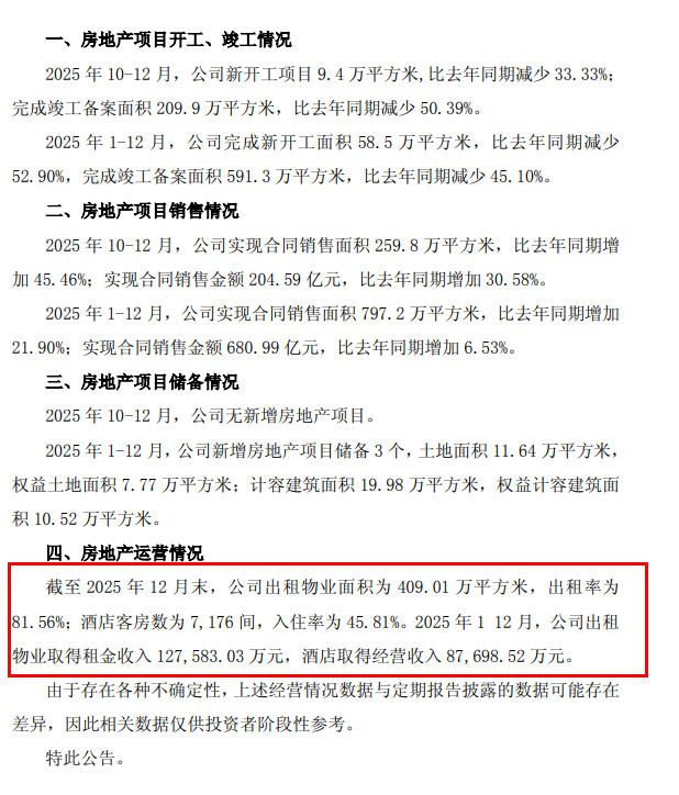 绿地控股最新披露的数据显示,截至2025年12月末,酒店客房数为7176间,入住率为45.81%。在2025年1—12月,酒店取得经营收入8.77亿元。