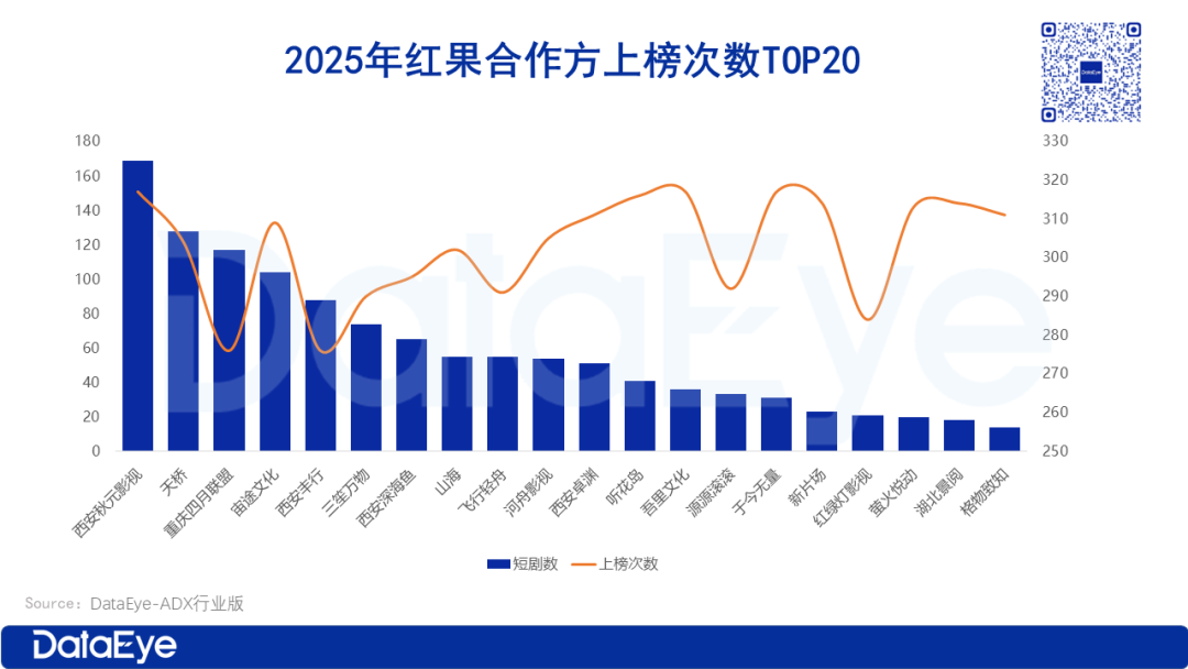 DataEye-ADX数据显示,从上榜短剧数来看,西安秋元(169部)、天桥(128部)和重庆四月联盟(117部)包揽TOP3,均是年度“高产王”。