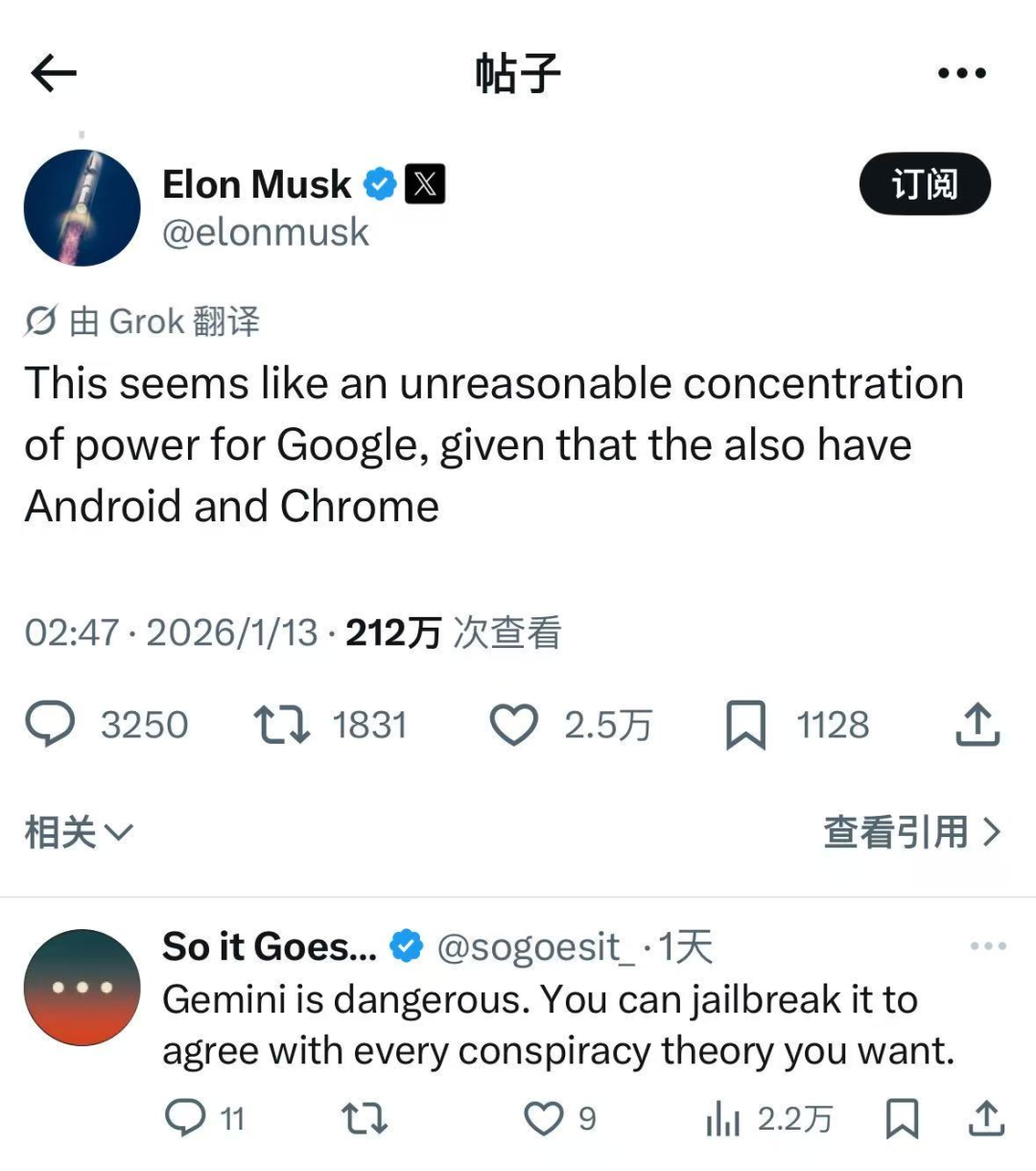 马斯克在社交媒体上公开炮轰称,“考虑到Google已经拥有Android和Chrome,这似乎是一种不合理的权力集中。”明眼人都能看到,马斯克觉得不合理,更多指向的是谷歌垄断地位,双方合作,谷歌才是更大的受益者。