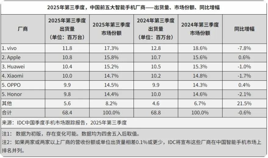 三季度中国智能手机出货量 图源:IDC