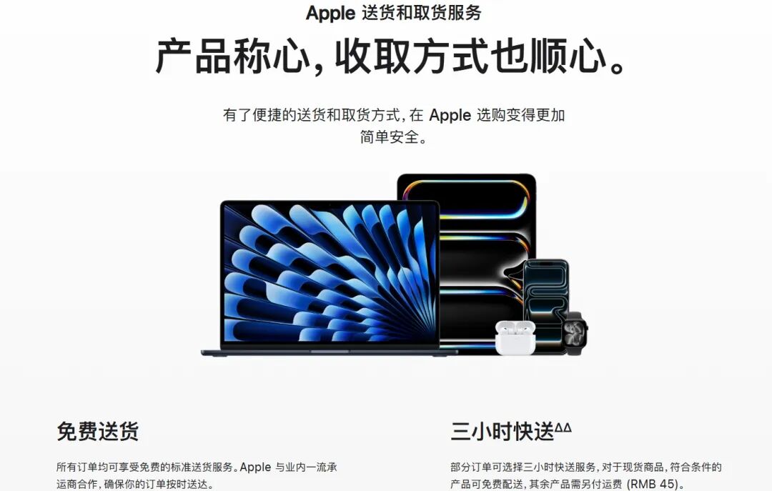 苹果也卷起了“半小时达”,9月iPhone 17系列新机开售时,全国4000多家Apple授权专营店网络接入美团闪购、淘宝闪购,提供正品现货30分钟送达服务。最近苹果还在官网正式上线“3小时快送服务”,免费配送iPhone、iPad、Apple Watch、Macbook Pro、Macbook Air和AirPods等产品。
