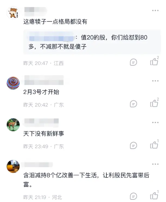 消息一出,网友吵翻天了。有的吐槽“一点格局都没有”,有的戏称,“还好有监管限制,只能减持1%改善生活,不然大股东要把卫星梦卖给小股东了”。