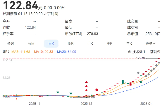 打开其走势图,股价连续涨停后已达122.84元,成为A股历史上最贵ST股之一。