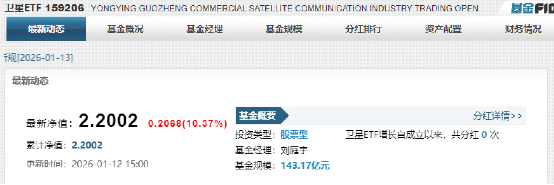 截至1月13日,卫星ETF(永赢国证商用卫星通信产业 ETF)最新规模已达143.17亿元,成为全市场首只百亿级卫星主题基金。