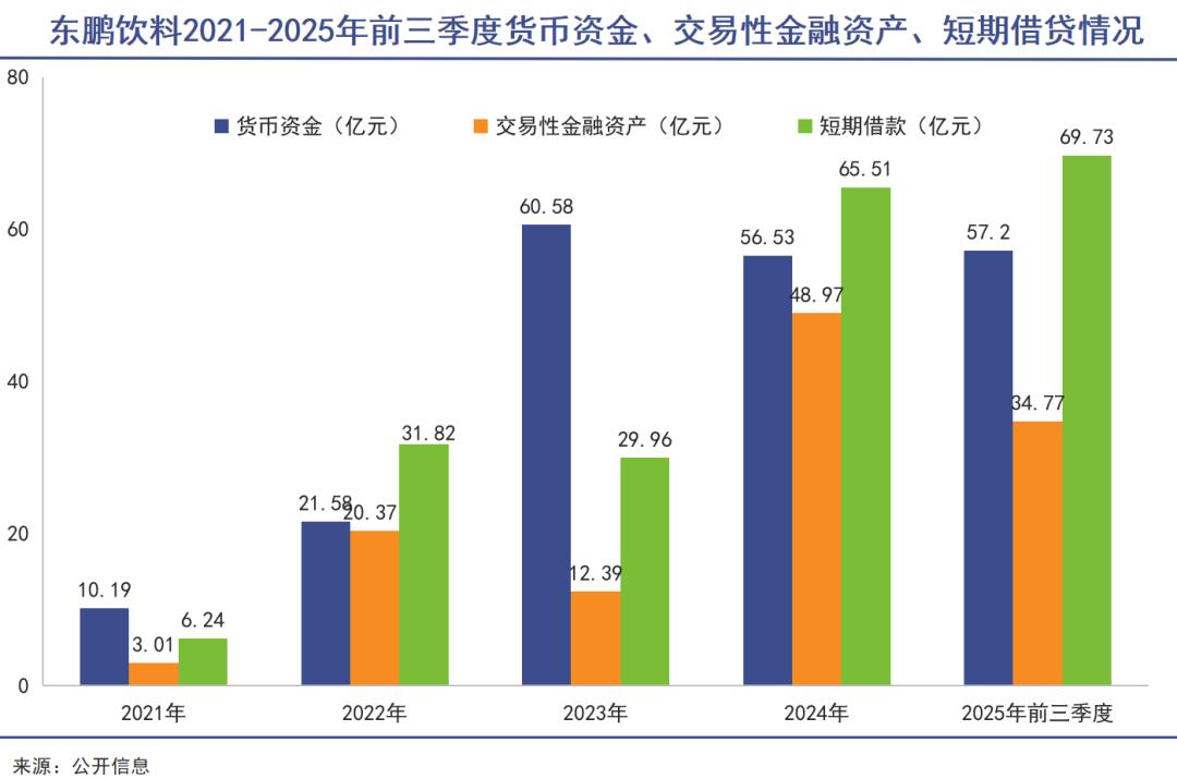 2024年末,东鹏饮料的短期借款余额较2023年末激增118.69%,达到65.51亿元;公司对此的解释是,借款主要用于支持扩大经营及提高资金效益。但这种以“扩大经营”为目的的借款一直在增加。2025年三季度末,其短期借款余额进一步扩大至69.73亿元。