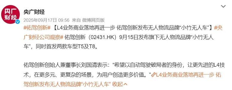 尤其是在2025年9月发布小竹无人车系列产品之后,公司在多个公开场合反复强调其在L4级无人物流车上的布局与落地能力,而这也正是地平线在此次增持公告中所重点提及的方向:双方将围绕L4自动驾驶加深协同,推动商用落地。