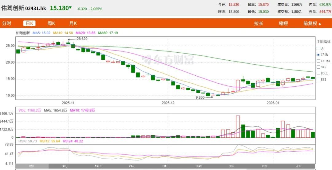 自去年11月股价持续下跌一个多月后,佑驾创新股价也重回增长态势;截至1月14日收盘,佑驾创新报收15.18港元/股,总市值63.42亿港元,较去年12月9.86港元/股的低点上涨近54%,但距去年3月39.5港元/股的高点已跌去超61%。上市刚满一周年的佑驾创新正处在一个须重建价值锚点、重获市场信心的关键阶段。
