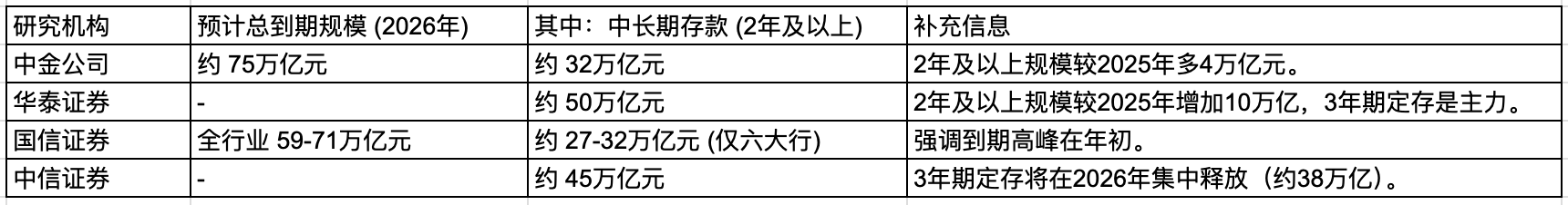 综合各家研报看,可以总结一些特点:第一,2026年将迎来过去几年罕见的到期高峰,尤其是2023年存入的三年期大额定存将集中到期。比如,中信证券测算,2026年中长期定存到期量45万亿元,显著高于此前年份20-30万亿元的到期规模;其中,2023年集中开展的三年期定存,在2026年到期量或达38万亿元。