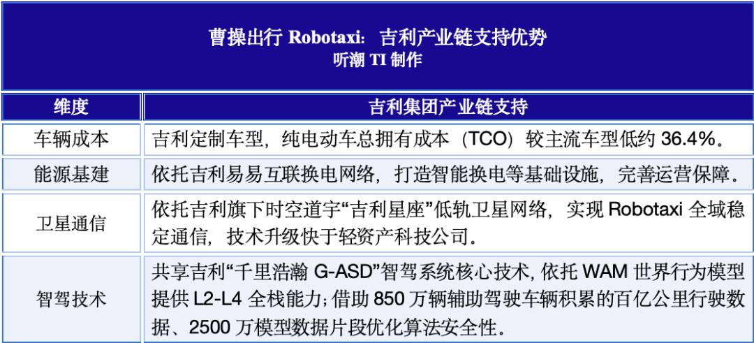 曹操出行的核心优势依然来自吉利集团全产业链的支持,从车辆成本、能源基建,到卫星通信、智驾技术,吉利集团全方位为曹操出行构筑差异化竞争壁垒。