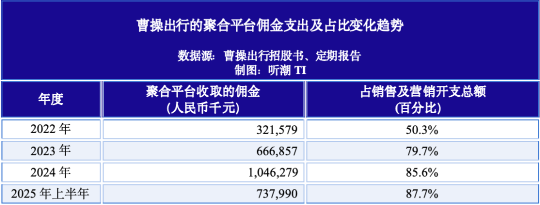 曹操出行的订单来源高度集中于高德、美团、腾讯地图以及百度地图等聚合平台。2022年-2024年,聚合平台收取的佣金从32亿元攀升至104亿元,2025年上半年达到73亿元,同比大增70%。