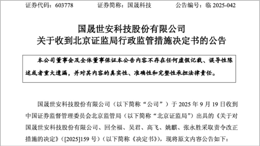 2025年9月19日,国晟科技及5名董监高被监管警示