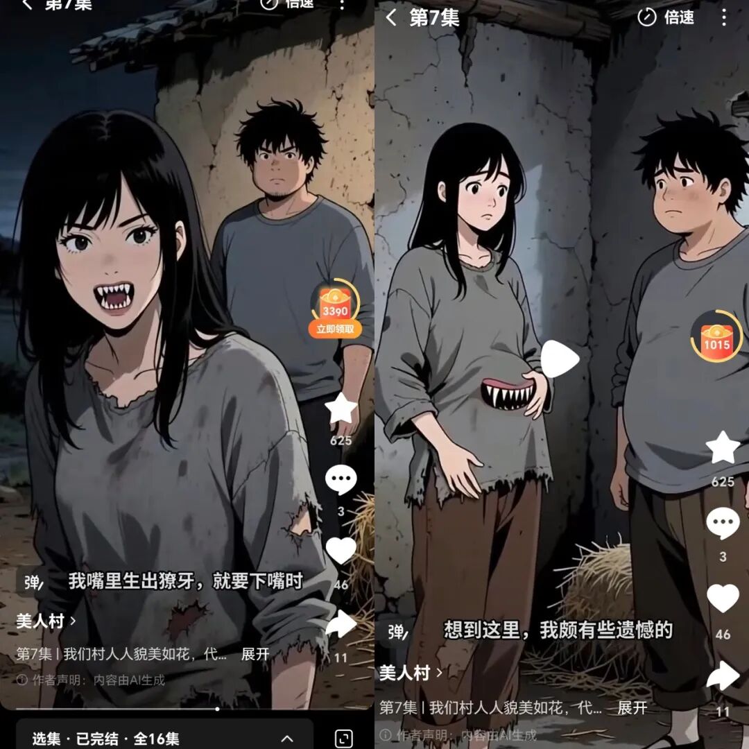 但人物一致性和环境连续性却始终是创作者的痛点。如AI真人短剧《美人村》,女主的诡异人设是二十岁时必须通过献祭一颗“恶人之心”完成蜕皮,在第7、8集,她露出锋利獠牙准备“吃人”时,獠牙却有时长在嘴中,有时长在肚子上,发型和相貌也时不时发生变化。