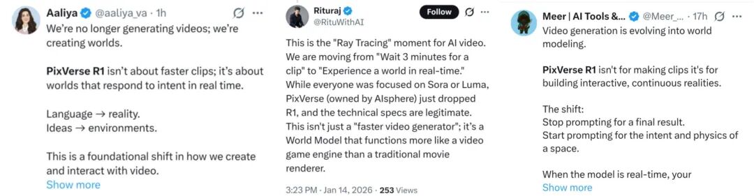 PixVerse R1刚上线,便在海外网站引起热议。有体验者惊喜评论,它不是用来制作片段的,而是用来构建互动、连续的现实。更有博主惊叹“它不仅仅是一个‘更快的视频生成器’,更是一个世界模型,功能更像视频游戏引擎。”简单来说,它不是一次简单的AI工具更新,而是一个截然不同的生产逻辑,一次AI视频工具的“质变”。