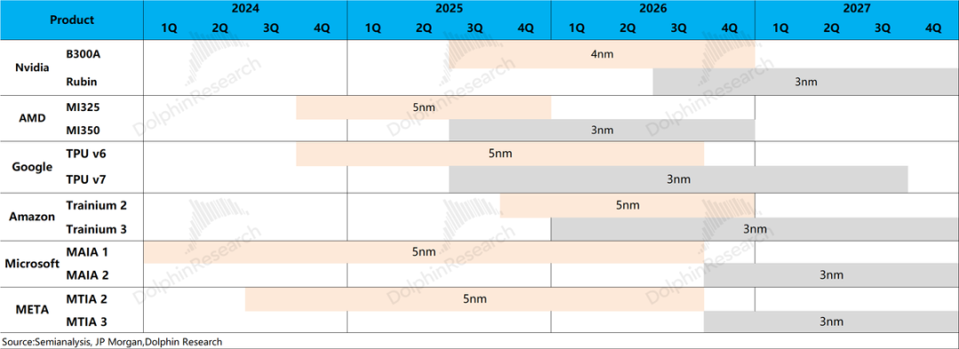 b)2nm进展及制程迁移:台积电的2nm在2026年进入大规模量产爬坡,公司会把苹果、高通等部分手机芯片的需求迁移至2nm的平台。与此同时,AI芯片也将全面升级至3nm时代,其中Rubin、MI350以及谷歌TPUv7都将使用台积电的3nm工艺进行生产。