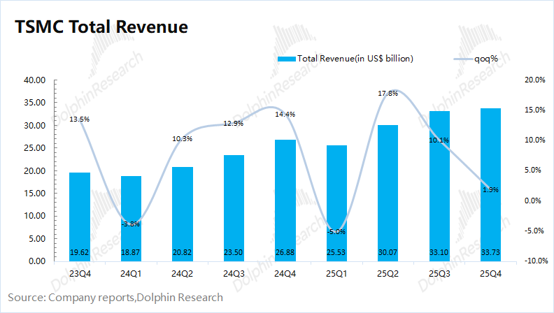 台积电在2025年第四季度实现营收337亿美元,超出公司此前指引区间(322-334亿美元)。本季度收入环比增长1.9%,主要受iPhone新机出货的带动。其中本季度美元升值对增长也有一定的影响,若从新台币口径看,公司本季度收入环比增长5.7%,是明显好于指引的。