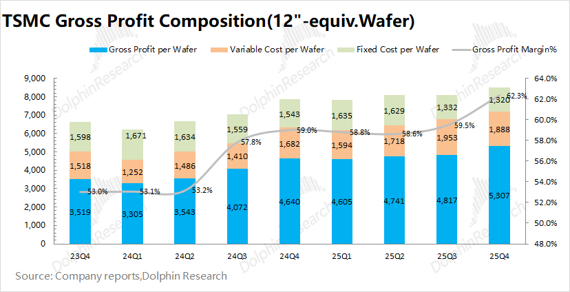 3)可变成本(其他制造费用):本季度台积电平均可变成本约1888美元/片,环比减少64美元/片。以台币口径看,单位可变成本基本持平,变动主要受美元升值影响。