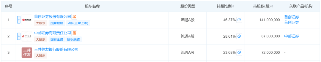天眼查显示,中邮基金前三大股东分别是首创证券(持股46.37%)、中邮证券(持股28.61%)以及三井住友银行股份有限公司(持股23.68%)。