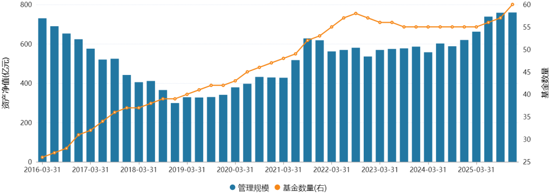回顾中邮基金近十年的管理规模,最鼎盛时期是2016年3月,彼时管理规模达到729.81亿元。此后自2021年9月至2025年3月期间,中邮基金一直处于600亿元上下,直至2025年6月重返700亿元以上,回归十年前的巅峰水平。