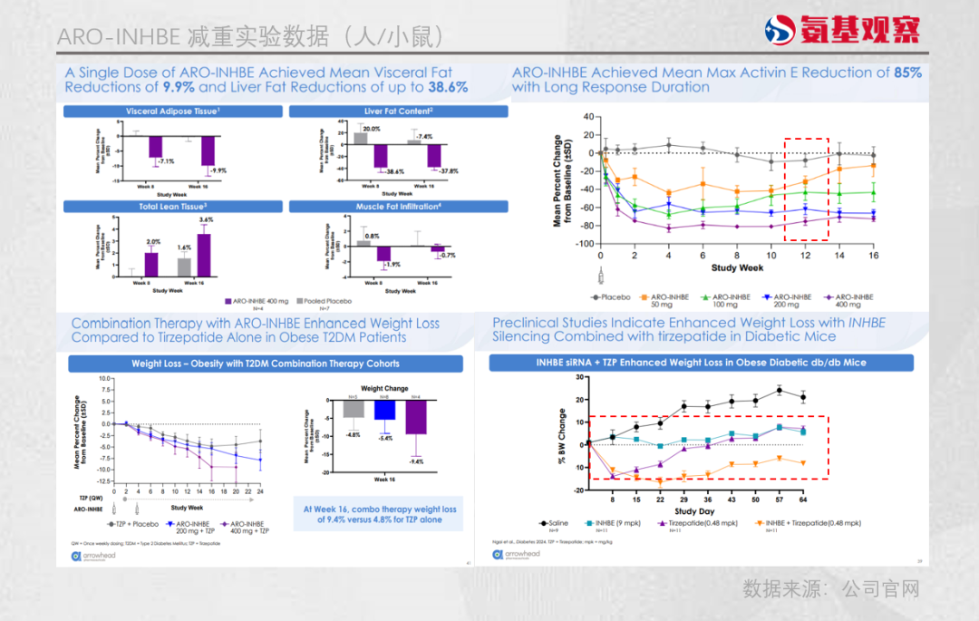 早期动物试验的趋势验证了siRNA的减脂潜力:9mpk QW的ARO-INHBE在小鼠中实现约94%幅度的mRNA敲低,达到26%减脂;同靶点WVE-007敲降效率75%,总体重降低10%。