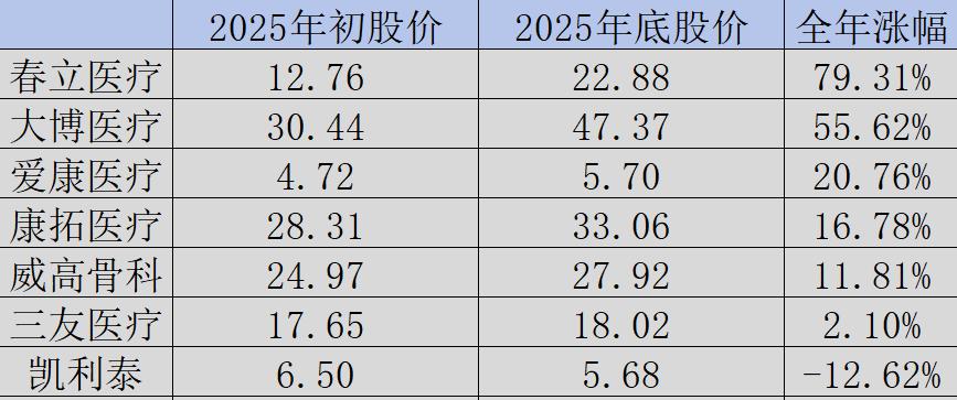 回望2025年,中国骨科板块走出强劲行情。在春立医疗、大博医疗的强势引领下,全年骨科头部企业股价平均涨幅达24.82%;除因股权争夺陷入ST的凯利泰外,其余头部企业均实现股价上涨,行业复苏态势清晰可见。