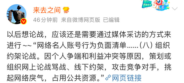 1月16日晚,新浪微博CEO王高飞通过个人微博@来去之间发布最新消息称:以后想论战,应该还是需要通过媒体采访的方式来进行。并引用了“网络名人账号行为负面清单”中第八项:“组织约架论战。因个人争端和利益冲突等原因,策划或组织网上论战骂战、线下约架,攻击竞争对手,挑起网络戾气,占用公共资源。”