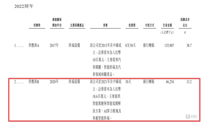 采购端的供应商依赖度则更为突出,且同样出现了合作时间线矛盾的问题。无独有偶,在福信富通供应商体系中也出现了类似的情形。报告期内,福信富通向前五大供应商采购的金额分别为27216.8万元、33810.4万元、40039.9万元、70039万元,分别占当期采购总额的77.5%、84.9%、89.5%、66.4%,其中供应商B常年位列公司第二大供应商,2022-2024年对其采购金额分别为4625.4万元、12638.5万元、14175.7万元,占采购总额比例达13.2%、31.7%、31.7%,采购占比逐年提升且保持高位。但据公司披露,双方自2020年起开展业务合作,而供应商B实际于2021年才在中国成立,注册资本1860万元,主营智能驾驶、智能电网解决方案等业务,这与销售端的问题如出一辙,供应商B尚未设立时,福信富通便与其开启了合作