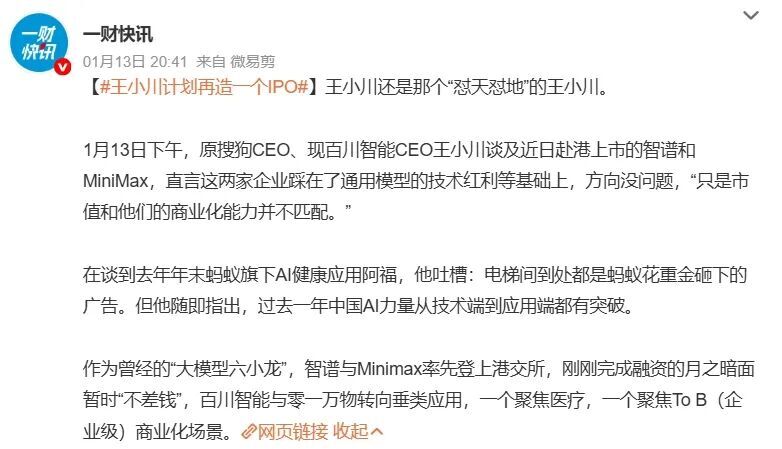 王小川在发布会上也评价了智谱和MiniMax在资本市场的表现,他认为,智谱和MiniMax主要还是踩在通用模型技术红利和政策支持的基础上,但目前这两家公司的市值和商业化能力并不匹配。