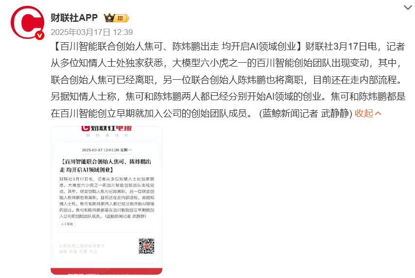 早在2024年,王小川就曾表示百川智能的业务重心将转向医疗领域。2025年初,百川智能将B端组的PE(提示词工程)团队调整至产研组,裁撤了主要负责金融行业ToB业务的B端组。随后,公司的联合创始人陆续出走,只剩下茹立云管理医疗To B团队,这也被外界视为百川智能要坚定押注AI医疗赛道的信号。