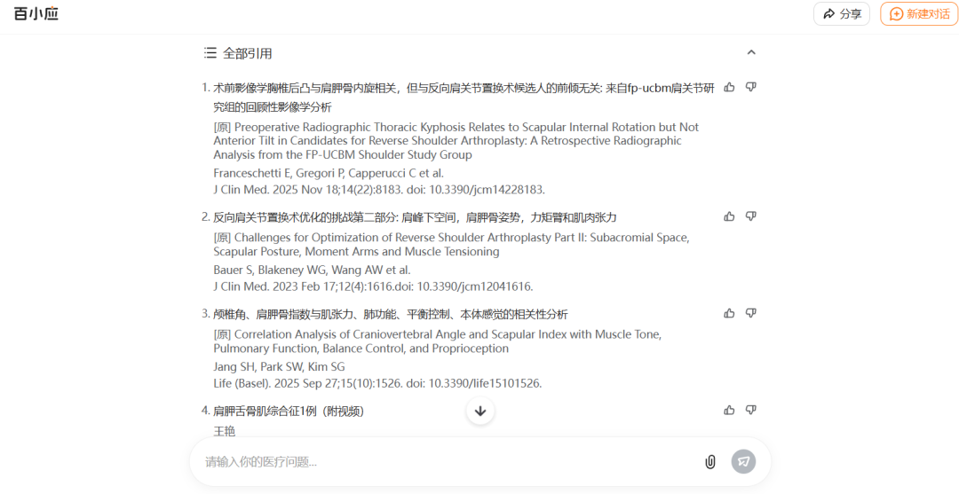 百小应的“医生版”,与号称美国医生版ChatGPT的“OpenEvidence”十分相似,都强调循证医学和证据溯源,辅助医生做临床决策,能帮医生梳理治疗方案、分析科研文献等,而且保证引用的文献都是真实存在的。