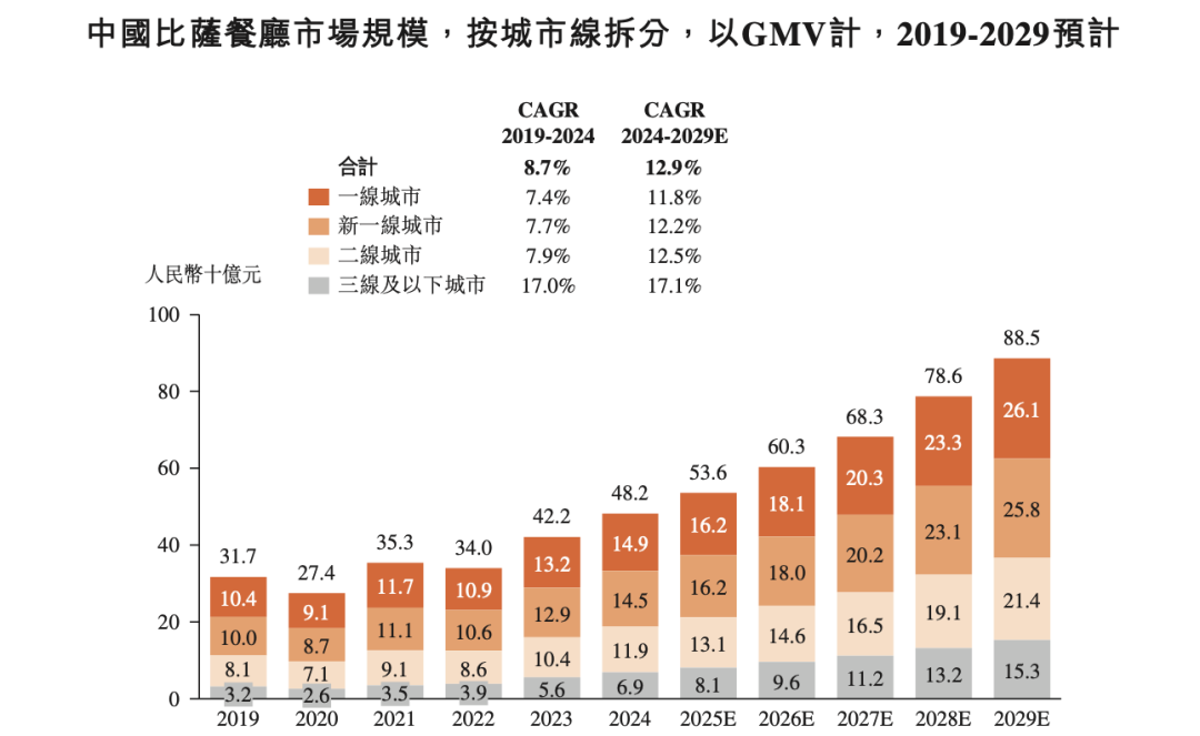 据灼识咨询数据,中国比萨餐厅市场规模于2019年的317亿元增长至2024年的482亿元,预计2024年至2029年的复合年增长率达12.9%,于2029年达885亿元。