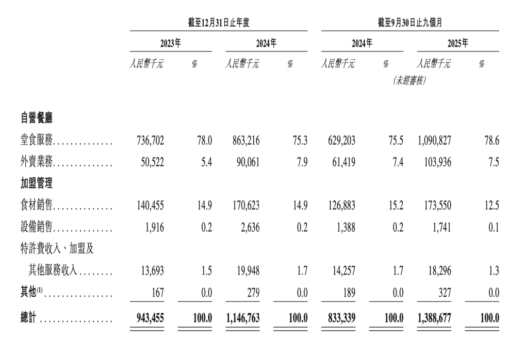 具体来看,2025年前9个月,比格比萨来自堂食服务的收入为10.9亿元,占比为78.6%;外卖业务收入1.04亿,占比为7.5%;来自食材销售收入为1.73亿元,占比为12.5%;特许费收入、加盟及其他服务收入1830万元,占比为1.3%。